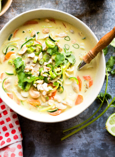 - swapped out traditional heavy cream or milk-base for a creamy cashew base, making this a dairy-free tomato soup (yet you wouldn’t know it!)