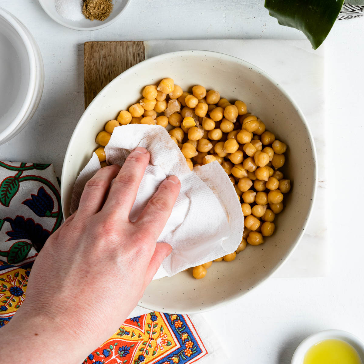 - Drain and rinse chickpeas. Pat dry on a clean towel and transfer to a bowl.
