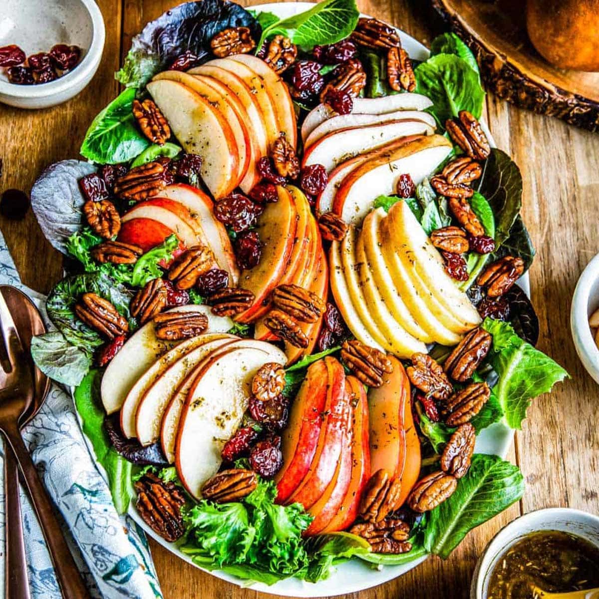 - Combine all the greens with half the sliced pear and apple, all the dried cherries and half the candied pecans in a large bowl. Drizzle that mixture with a bit of the dressing then toss again.