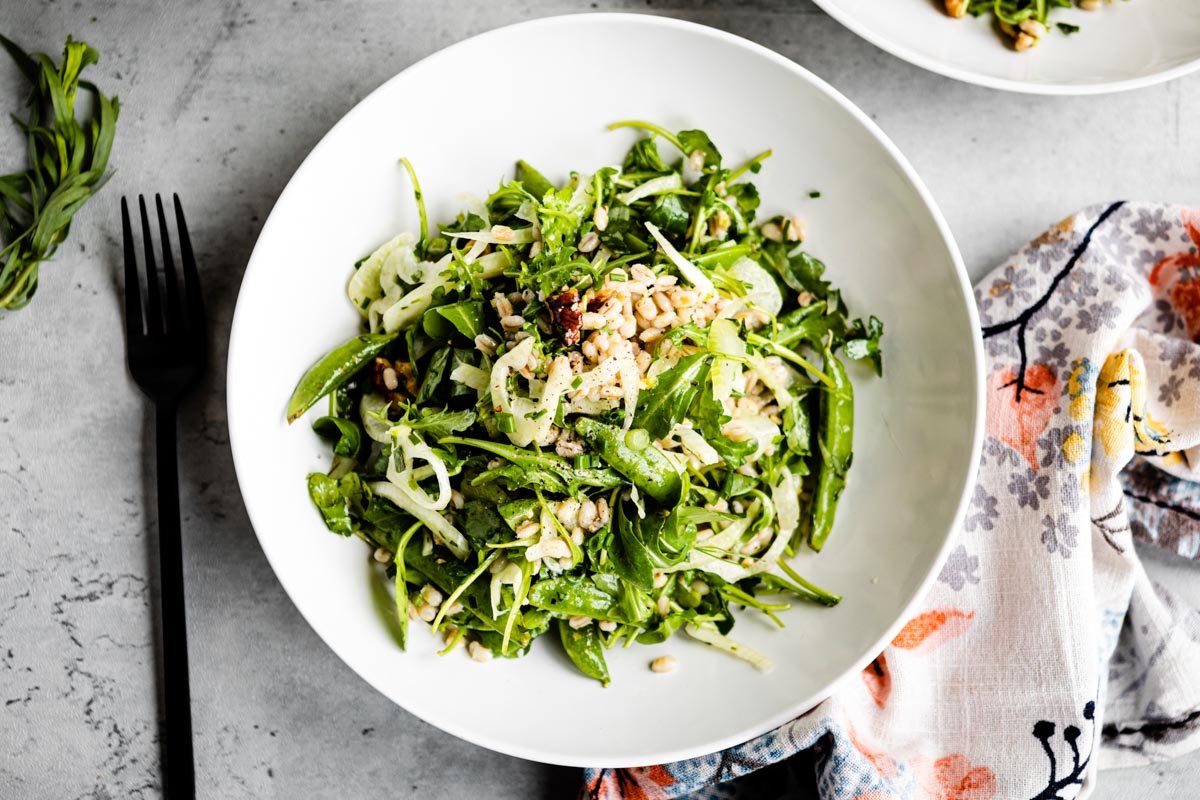 - Place the fennel in a bowl with arugula, barley, pea pods, walnuts and green onions.