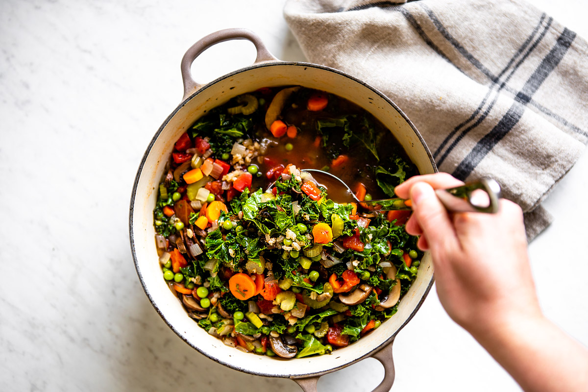 The best vegetables to put in any veggie soup recipe are the ones you like! I’ll go even further to say that I tend to throw whatever leftover veggies I have in my fridge into soup – roasted veggies, greens, a little of this or that. In addition to broth and barley, here’s a few vegetables you can toss in for a major flavor win: carrots, zucchini, potatoes, corn, green beans, peas, kale, chard, mushrooms, peppers, and tomatoes.