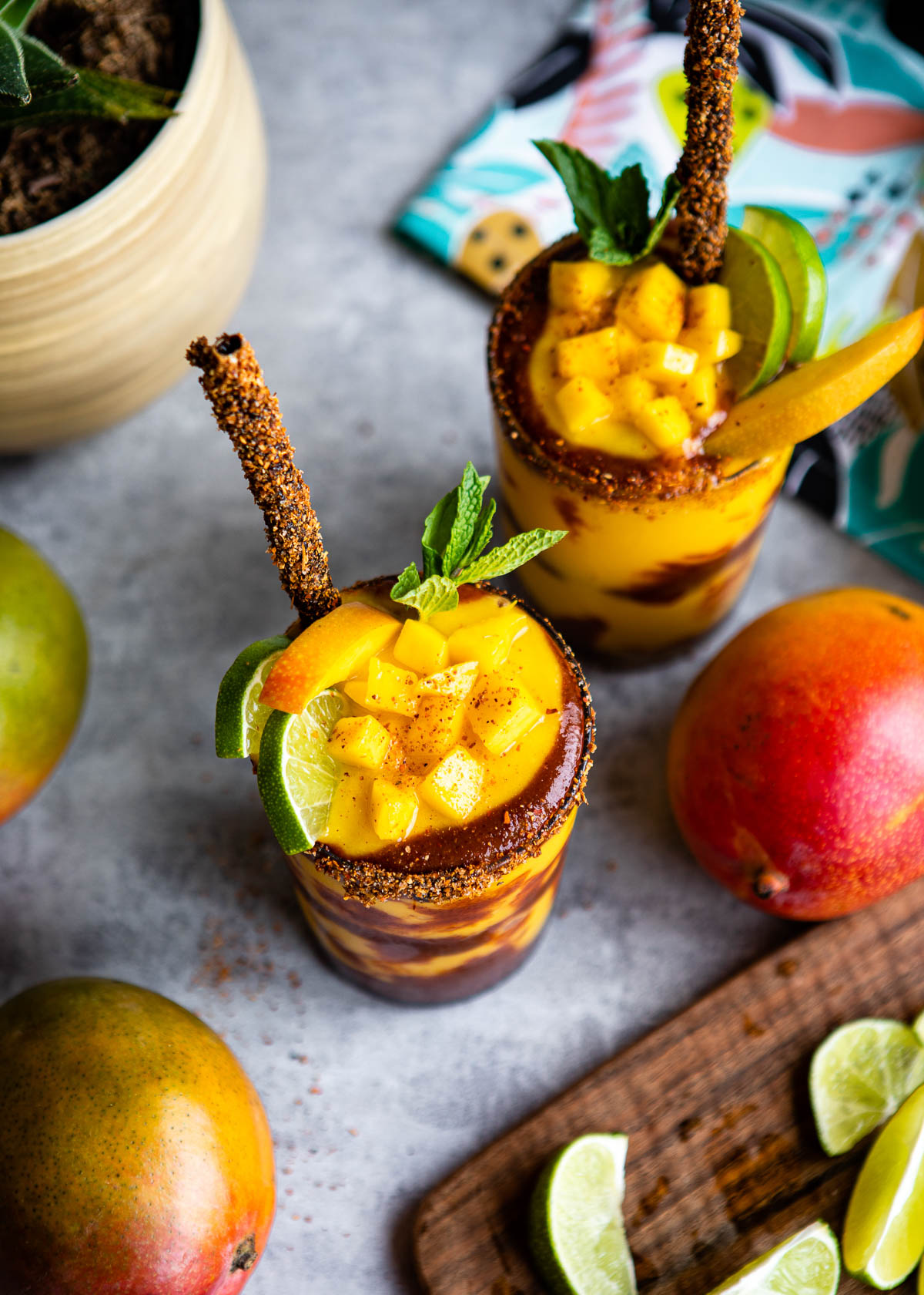 Mexican mangonada, also known as chamoyada, is a newer beverage creation, thought to have originated in Mexico in the 1990s. It starts with a flavorful fruit smoothie base, then adds layers of chamoy sauce, and is finished off with a tamarind straw and a glass rim coated in chamoy and Tajรญn. It’s non-alcoholic, yet has the look and taste of a specialty cocktail. I don’t think anyone would flinch if you added some booze to this if that’s your style.