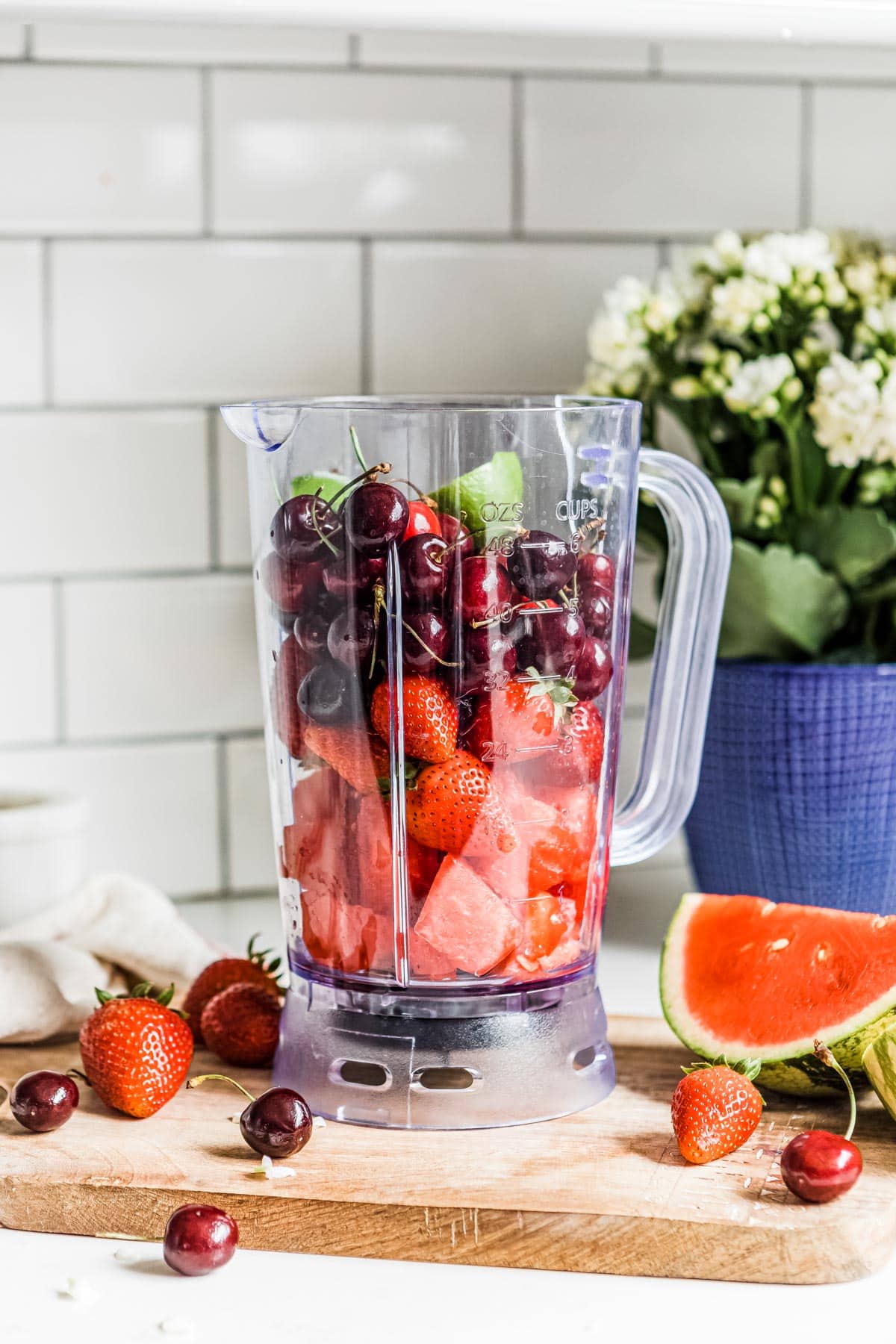 - Add watermelon, strawberries, cherries and lime juice to the blender.