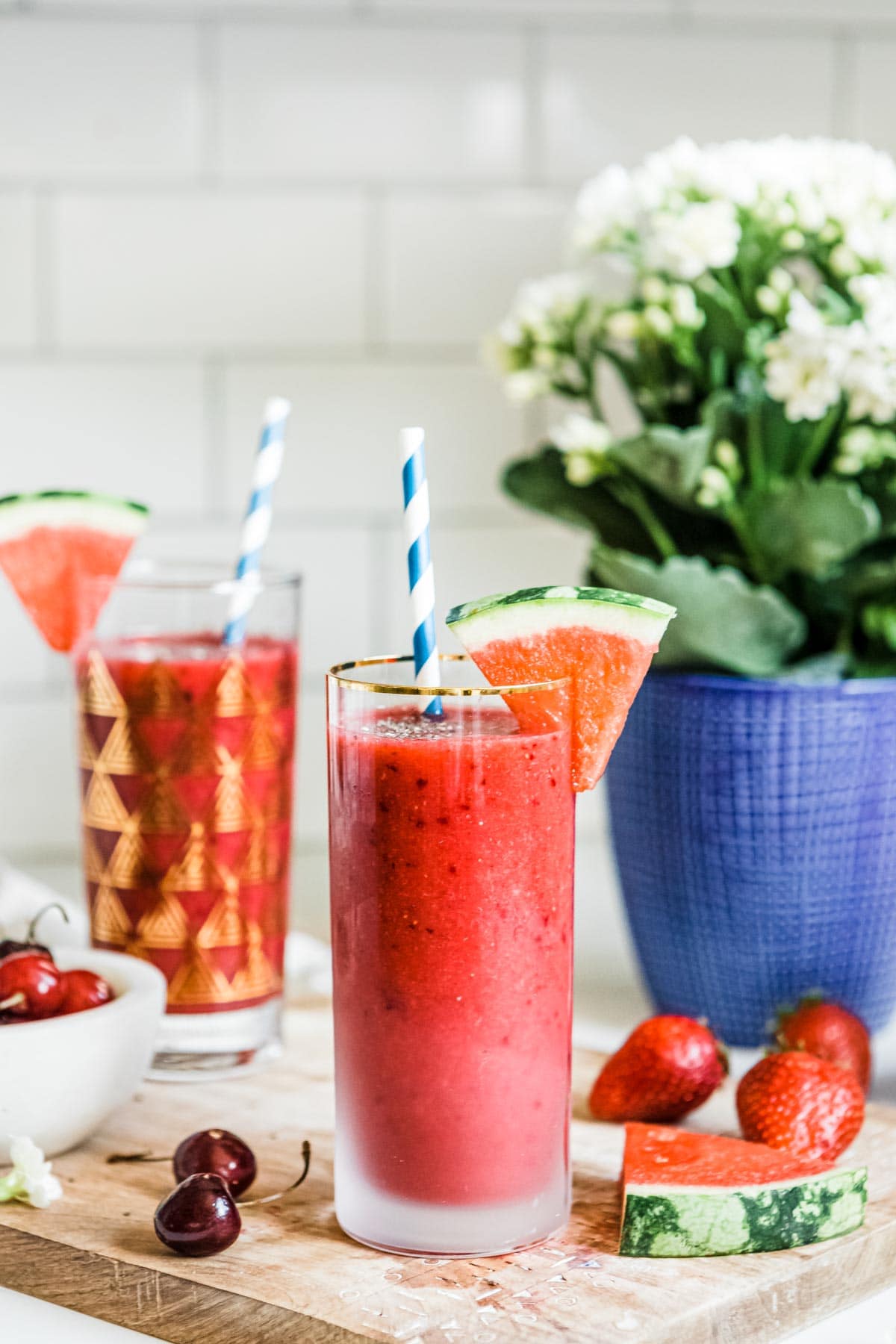 My watermelon smoothie blends cherries, watermelon, strawberries and lime. It’s super refreshing and antioxidant-loaded!
