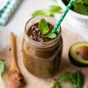 I use spinach, fresh mint, almond milk, frozen banana, avocado and cacao powder to make my chocolate mint smoothie. These ingredients might sound a bit odd together yet once blended, they create the perfect shake-like texture and rich chocolate flavor youโ€™re looking for.