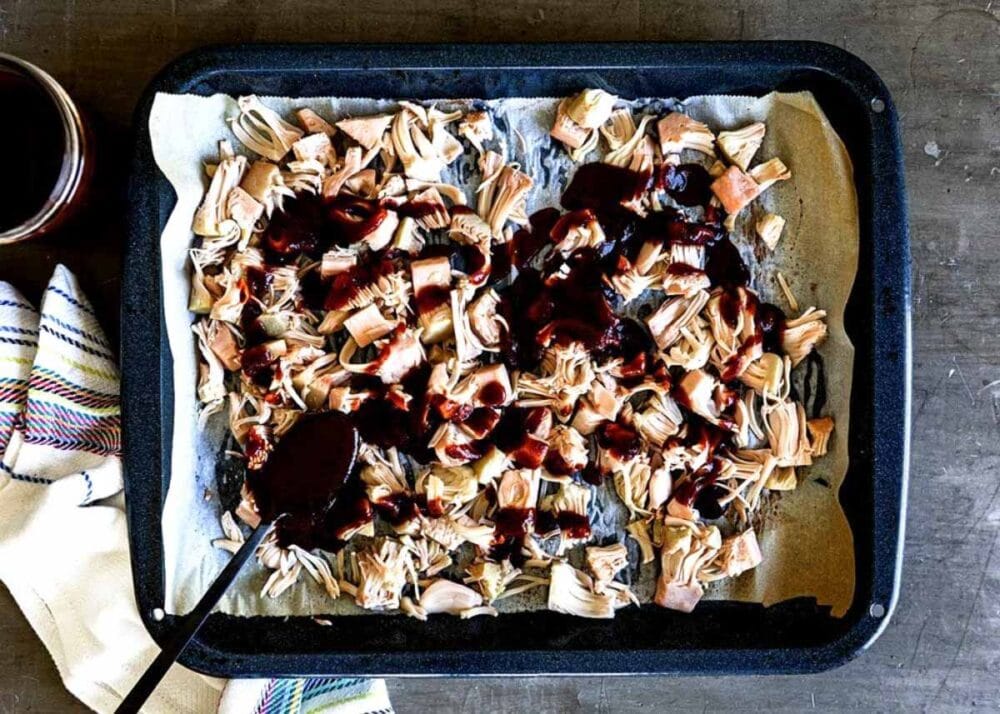 • Remove from oven and use two forks to shred the jackfruit. If desired, remove any of the hard, tough seed pods. Pour 1/2 cup of the BBQ sauce over the shredded jackfruit and toss to coat. If needed, add a little more sauce. Roast for an additional 10-12 minutes, or until sauce has thickened and darkened. Remove from oven and stir in remaining BBQ sauce, if desired. (This is personal preference.)