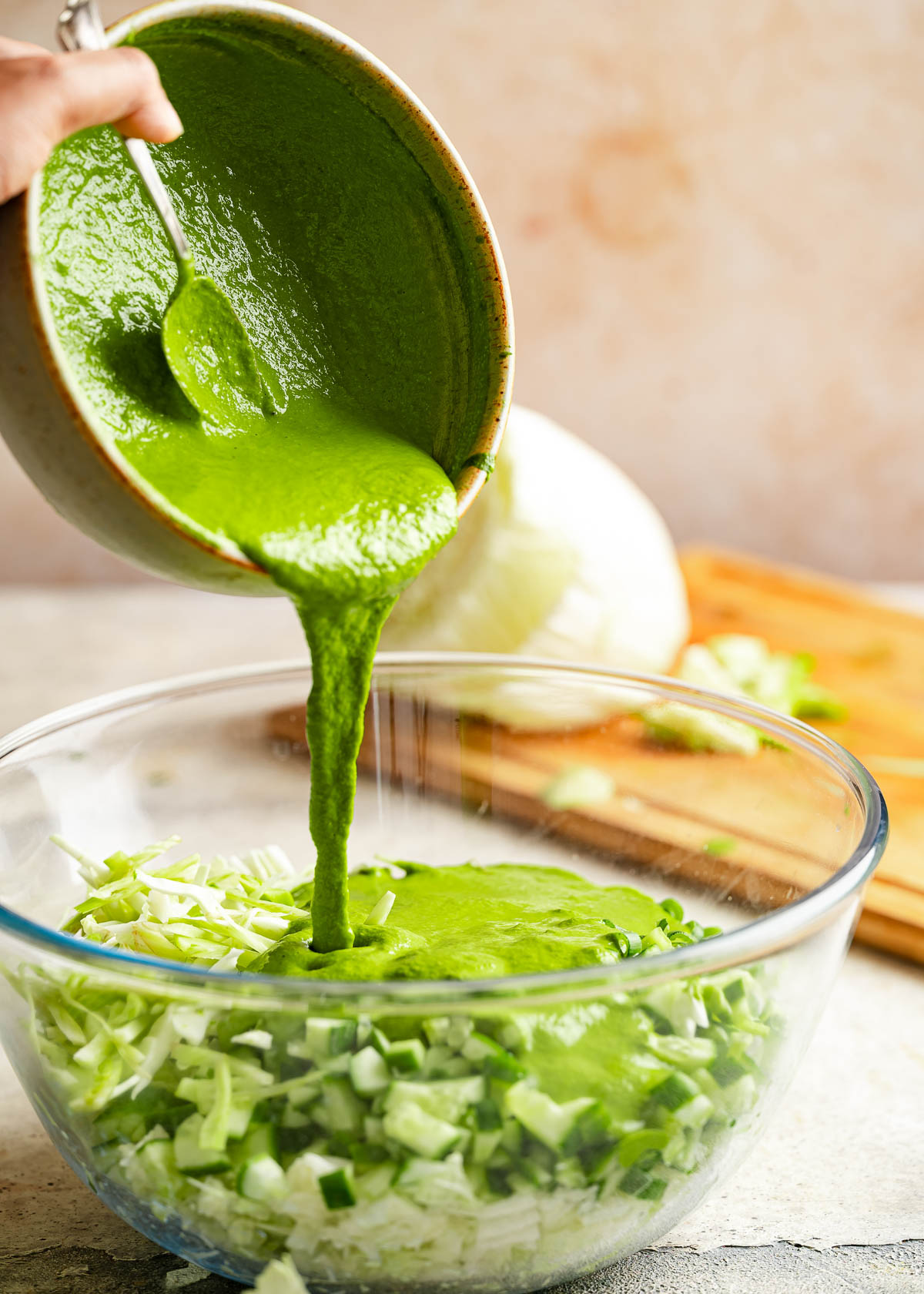 - Pour the finished green goddess dressing into a bowl and set it aside while you prep the salad.